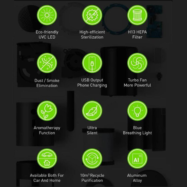 - ازبین برنده انواع ویروس و باکتری با کمک اشعه UV - ولتاژ کار 5 ولت و دارای خروجی متعدد برق برای دیگر لوازم با ولتاژ کار مشابه - فیلتر ترکیبی یدکی - قابل حمل ( قابل استفاده در منازل و اتومبیل ) - بدنه آلومینیوم و بادوام - خوشبو کننده