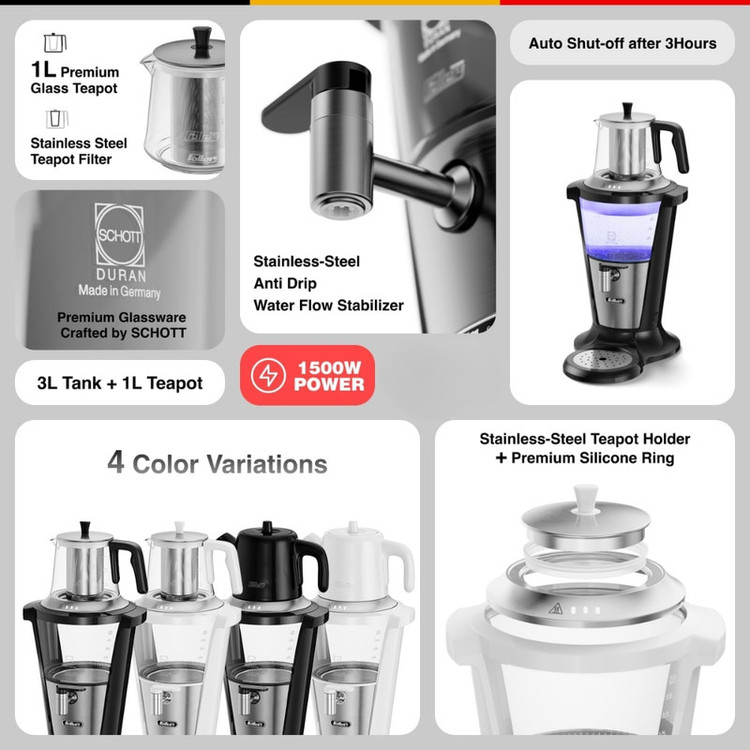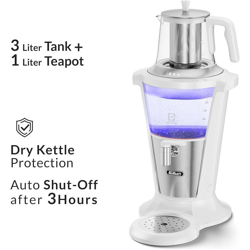 سماور برقی مدل TS380P از محصولات شرکت فلر (Feller) است که با آن به راحتی می توانید چای یا دم نوش مورد علاقه ی خود را تهیه کرده و برای مدتی طولانی گرم نگه دارید. در جنس بدنه و قطعات این محصول، دقت زیادی شده است. دستگاه به واسطه ی دستگیره های عایق و پلاستیکی، به راحتی قابل استفاده است. استفاده از شیشه و استیل ضدزنگ در بدنه ی سماور نه تنها به زیبایی آن می افزاید؛ بلکه این امکان را فراهم می سازد که کاربر میزان آب موجود داخل سماور را مشاهده کند. قوری سماور برقی فلر مدل TS380P از ظرفیت مناسبی بهره می برد و از جنس چینی ساخته شده است. درپوش سماور هم به گونه ای طراحی شده که زمان قرارگیری قوری روی آن، مسیر انتقال بخار باز می ماند و قوری به بهترین شکل گرم نگه داشته می شود. استفاده از این سماور، فوق العاده ساده بوده و برای روشن شدن کافی است کلید پشت آن را فشرده و حالات جوشاندن آب سماور یا گرم نگهدارنده را از طریق دکمه ی تعبیه شده روی دسته انتخاب کنید. در مدل TS380P سینی چکه گیر هم در نظر گرفته شده است.