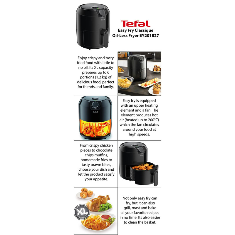 سرخ کن تفال مدل EY201 از جدیدترین سری سرخ کن های بدون روغن شرکت تفال است. قابلمه این دستگاه که ظرفیت 4.2 لیتری و برای مواد غذایی 1.2 لیتر (مناسب برای 6 نفر) دارد و روکش آن نچسب می باشد و خود دستگاه نیز در رنگ مشکی تولید شده است و طراحی زیبایی دارد. دمای سرخ کردن بر روی این دستگاه توسط کلید ولومی از 80 تا 200 درجه سانتی گراد قابل تغییر است و برای تایمر 60 دقیقه ای نیز کلید ولومی جداگانه ای طراحی شده است. این محصول توانایی انجام 4 کار را دارد: سرخ کردن، بریان کردن، کیک پختن و گریل کردن. که تمامی این کارها مانند سرخ کردن ماهی، بادمجان و پخت پیتزا و کیک بدون نیاز به روغن انجام میگیرد در نتیجه مواد غذایی پخته شده، سالم تر و رژیمی می شود. تمامی قطعات غیربرقی سرخ کن تفال مدل EY201 قابل شستشو در ماشین ظرفشویی می باشد. در پایان باید ذکر کرد که این دستگاه سیستم قطع کن خودکار نیز دارد که عملکرد ایمنی دستگاه را بالا می برد.