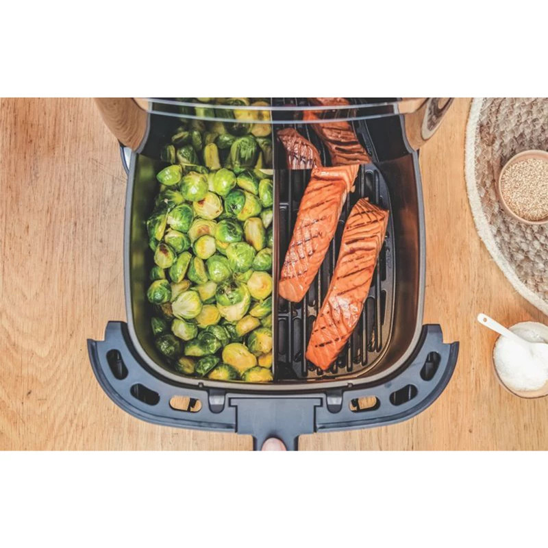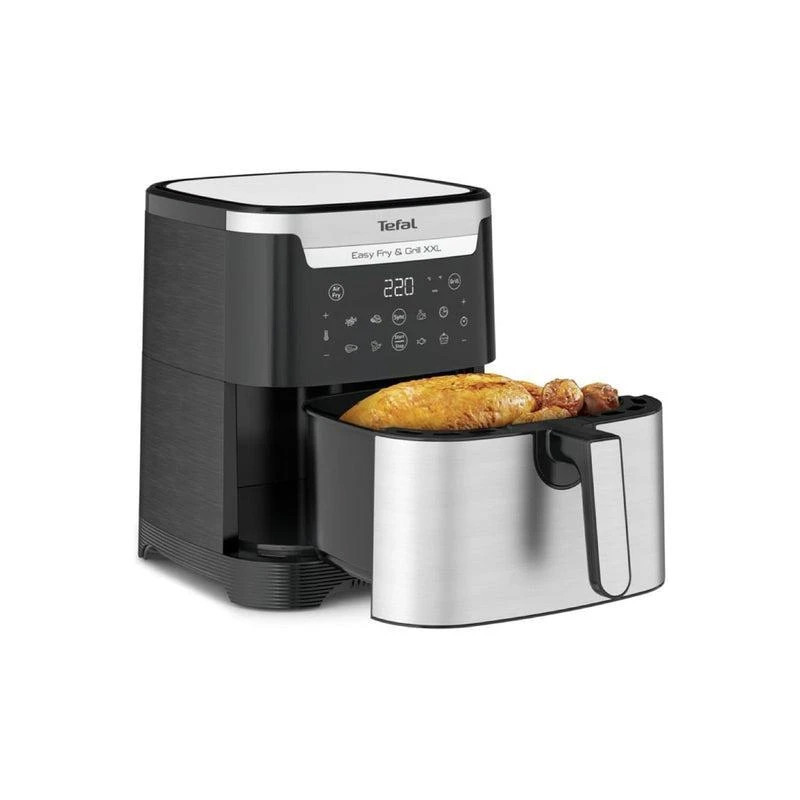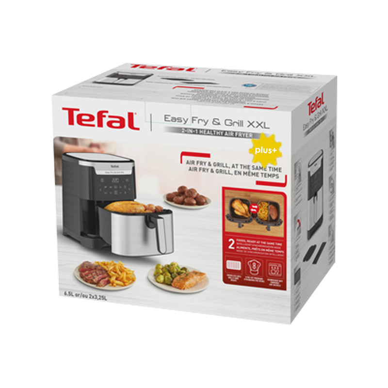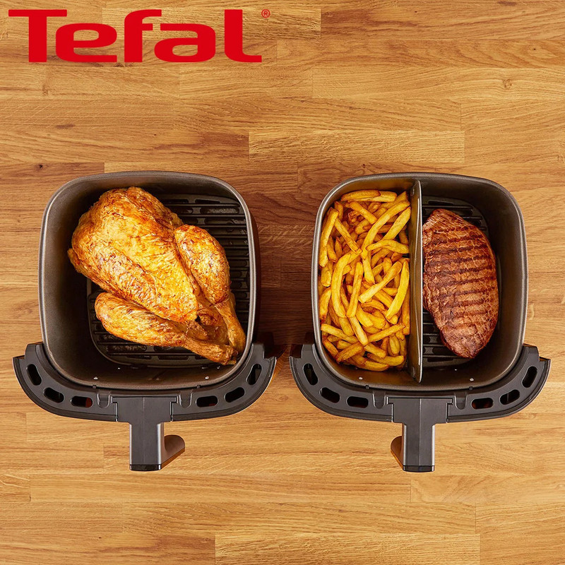 سرخکن تفال مدل EY801D15-plus یک دستگاه حرفهای و مدرن برای پخت سالم و کمچرب انواع غذاهاست. این محصول با ظرفیت ۵.۶ لیتر و توان ۱۸۳۰ وات، امکان سرخ کردن، گریل و پخت انواع مواد غذایی را بدون نیاز به روغن یا با تنها یک قاشق غذاخوری روغن فراهم میکند. فناوری Extra Crisp با ایجاد تعادل در دما و جریان هوای گرم، باعث ترد و طلایی شدن غذاها میشود بدون آنکه بافت داخلی آن خشک یا سفت شود. قابلیت Flexcook نیز به شما این امکان را میدهد تا بهصورت همزمان دو نوع غذای مختلف را در یک زمان بپزید. کنترل پنل لمسی، ۸ برنامه پخت از پیش تعیینشده، قابلیت گرمکردن غذا، پخت کیک و پیتزا، خشککردن میوه، گریل گوشت و سبزیجات بدون دود و شستوشوی آسان قطعات از دیگر ویژگیهای برجسته این مدل است. سرخکن EY801D15-plus انتخابی مناسب برای خانوادههایی است که به دنبال تغذیه سالمتر، کاهش مصرف روغن و صرفهجویی در زمان هستند.