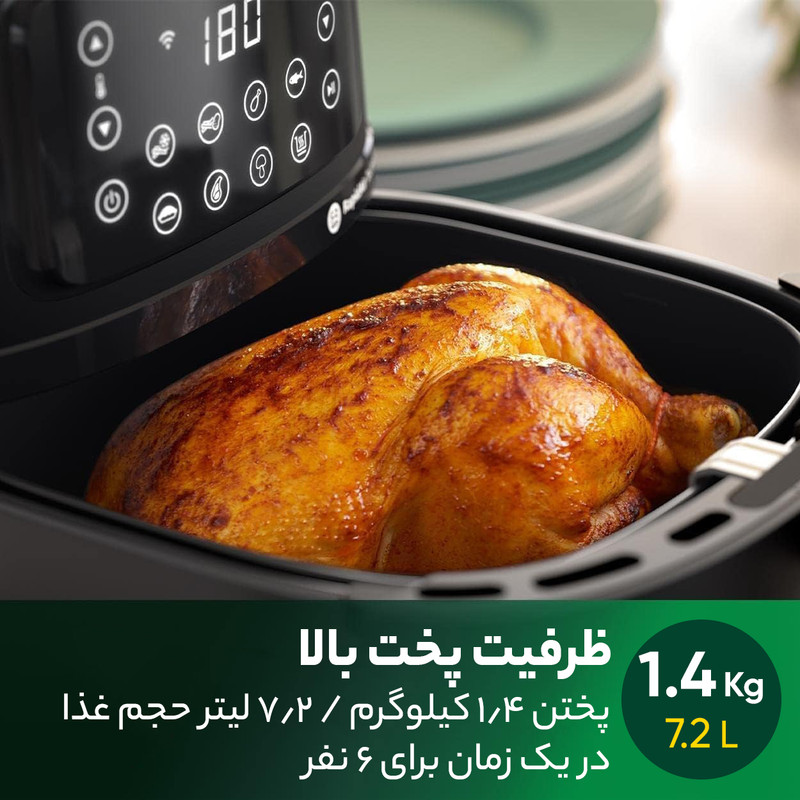 سرخکن های بدون روغن نسل جدید فیلیپس هر آشپزخانه ای را از هر وسیله پخت و پز مانند قابلمه ، فر ،کیک پز ، تنور و ....بی نیاز میکند . مدل HD9285/93 با ظرفیت 7.2 لیتر واقعی مناسب برای خانواده های پرجمعیت نیز است زیرا در هر بار استفاده به راحتی میتواند غذای 7 نفر را آماده کند . این مدل توانایی ارایه 16 نوع پخت (سرخ کردن ، پختن ، گریل کردن ، کباب کردن ، تست ، یخزدایی ، تخمیر ، آبگیری ، گرم کردن مجدد و... ) را دارد . سرخکن hd9285/93 فیلیپس دارای یک قالب کیک مخصوص است که در دیگر مدل های hd9285 این قالب وجود ندارد . شما به راحتی میتوانید با کمک این قالب مخصوص که کمپانی فیلیپس طراحی کرده است انواع کیک ، لازانیا ، تهچین و ... را آماده کنید . با قابلیت کنترل از راه دور (اتصال به اینترنت ) به راحتی میتواید دستورالعمل غذا را انتخاب کنید و به سرخ کن بفرستید تا دستگاه به صورت هوشمند شروع به کار کند . این مدل دارای تکنولوژی Rapid Air است که فقط در تعداد کمی از سرخکن های فیلیپس وجود دارد. Rapid Air : طراحی ستاره ای شکل مخزن دستگاه باعث چرخش سریعتر هوای گرم میشود تا بیرون غذا ترد و داخل آن لطیف باقی بماند . صفحه نمایش این مدل کاملا لمسی است تا کاربر بتواند از منو های پیش فرض یا تنظیم دما و زمان به صورت دستی به راحتی بهره ببرد . از طریق HOME ID هر روز میتوانید دستورالعمل های مختلف انواع غذا های جهانی را دریافت کنید و با پخت غذا های جدید از هر وعده لذت ببرید . خاموش شدن خودکار و قابلیت شستوشوی قطعات در ماشین ظرفشویی از دیگر امکانات این غول هلندی است . با داشتن این محصول هم در زمان صرفه جویی میکنید و هم زندگی بسیار سالم تری خواهید داشت .